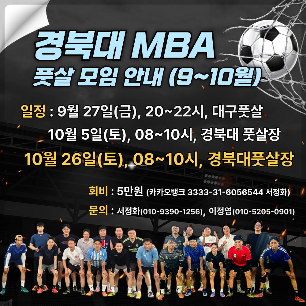 - 그리고 마지막으로 한달에 한두번씩 경북대학교 MBA 풋살모임을 진행하고 있기도 한데, 우리 5조 대다수가 멤버로 참가하고 있기도 합니다. 풋살 모임이 있다는 것에 많은 관심부탁합니다. ^^