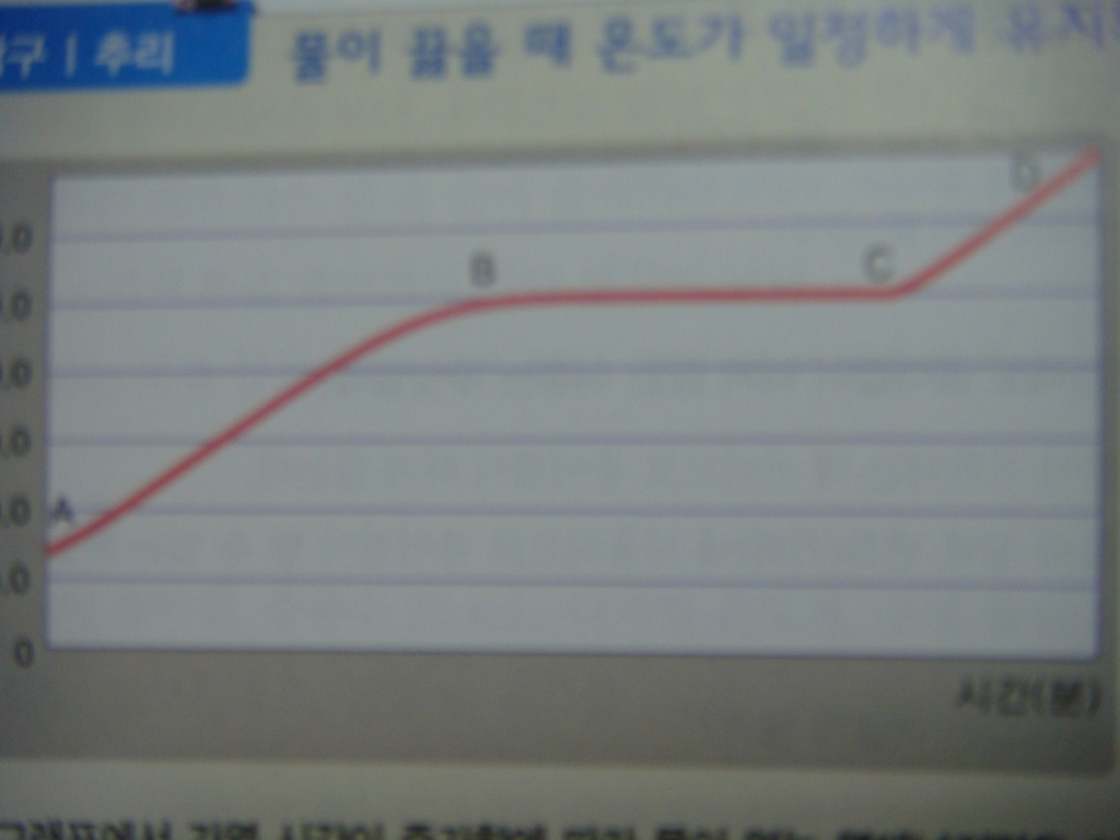 자습서에 있는 그래프를 보면, 평평한 구간이 있고, 온도가 많이 높아지는 구간이 있다.자습서의 그래프의 온도가 많이 높아지는 A-B구간은 고체로 얼음이 물로 녹는 구간으로 열에너지는 물질의 온도를 높이는 데 사용되었다. 반면에 평평한 B-C구간에서는 고체(얼음)에서 액체(물)로 상태변화 (융해)하는 구간으로 고체+액체이고, 가해 준 열에너지는 모두 상태변화에 사용되므로 온도가 올라가지 않고 일정하게 유지된다. (이때, 고체에서 액체로 상태변화할 때 주위로부터 흡수하는 에너지, 융해열로 인해 주위는 온도가 내려간다.)또 C-D구간은 액체로 A-B구간처럼 열에너지가 온도를 높이는 데 사용되었다.