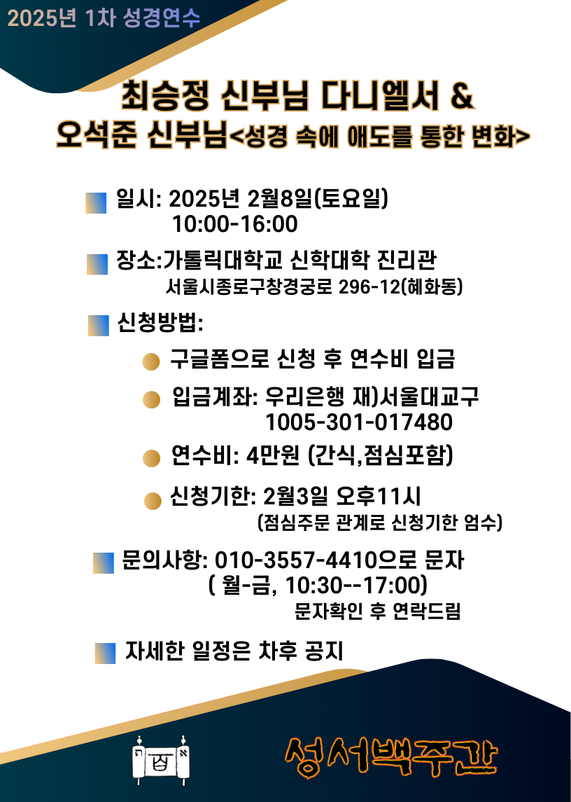 최승정베네딕토신부님 & 오석준레오신부님, 성서백주간 연수 작성자빗방울|작성시간25.02.02|조회수412 목록 댓글 2 글자크기 작게가 글자크기 크게가 https://forms.gle/wvcMecQ8kWKtSZLJ7 다음검색 현재 게시글 추가 기능 열기 북마크 공유하기 신고 센터로 신고 댓글 댓글 2 댓글쓰기 답글쓰기 댓글 리스트 작성자주안 | 작성시간 25.02.05 고맙습니다~^^ 답댓글 작성자빗방울 작성자 본인 여부 작성자 | 작성시간 25.02.05 네, 감사합니다^^ 댓글 전체보기