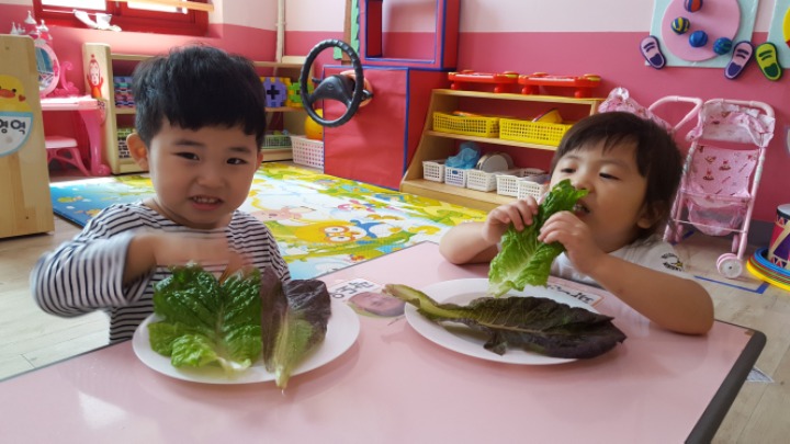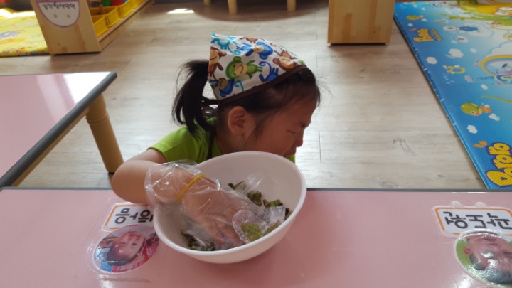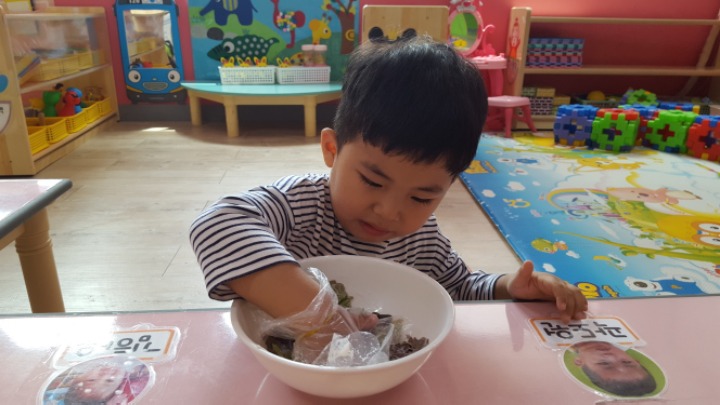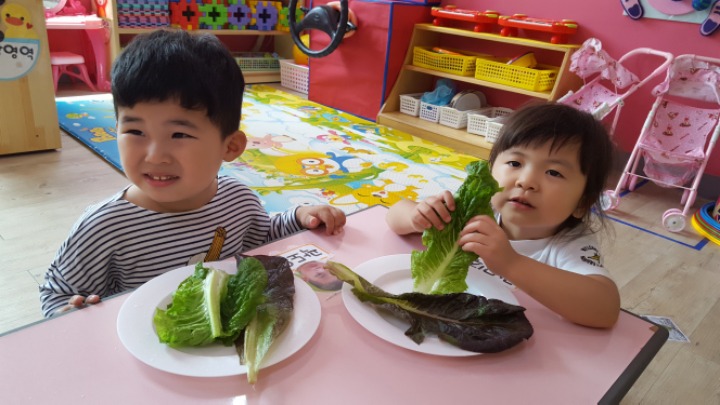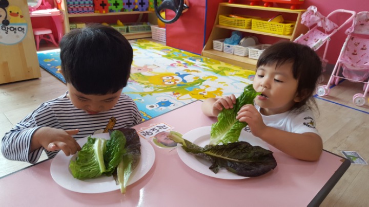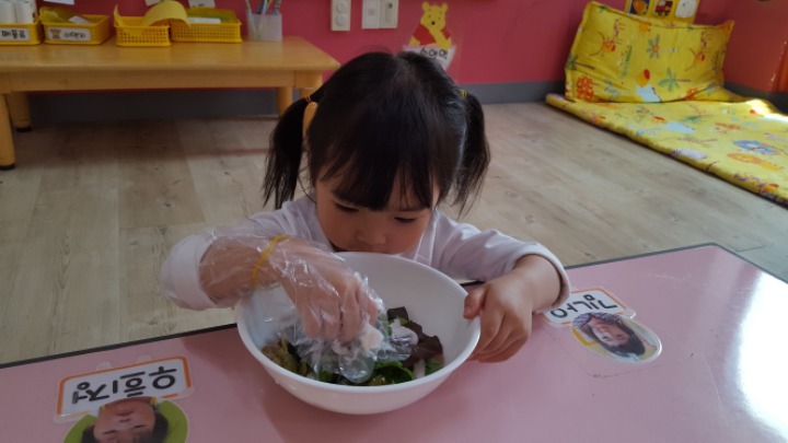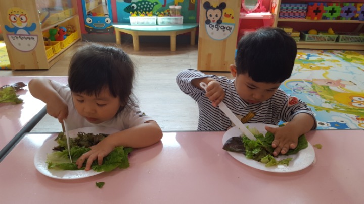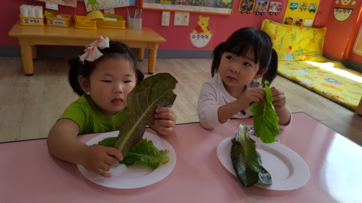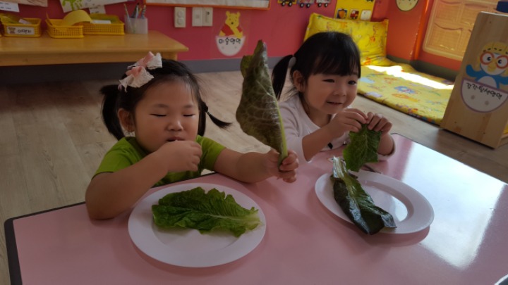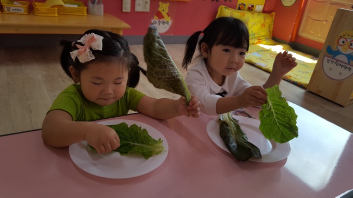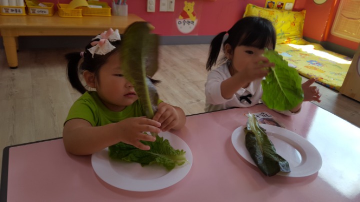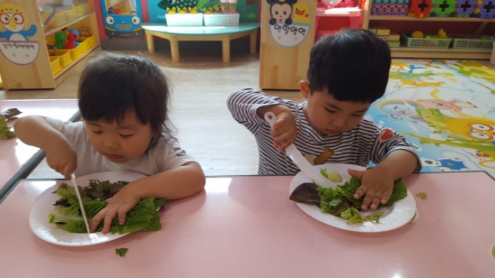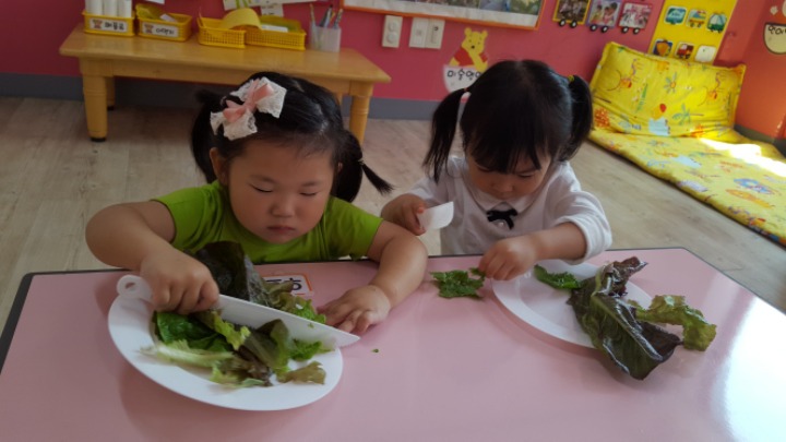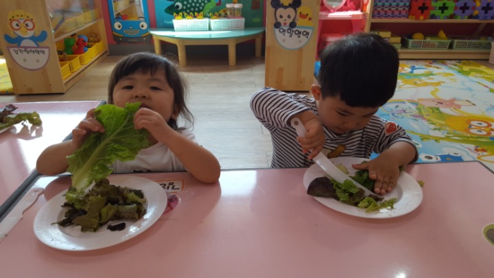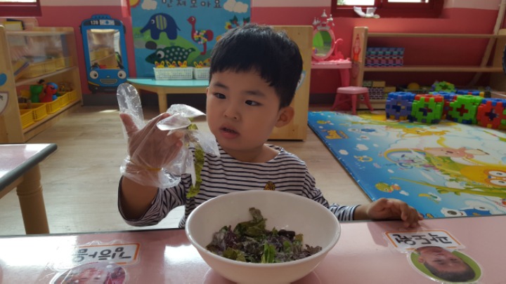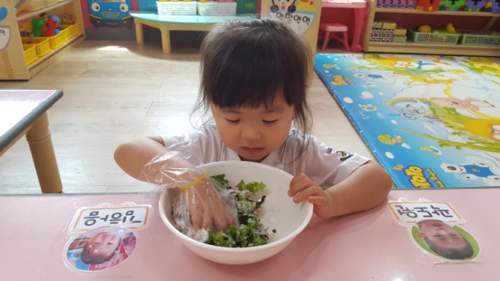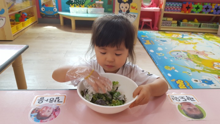 상추를 탐색하면서 떼어먹기도 하고 모형칼로 잘라보기도 했는데 손으로 뜯기도 했어요.요거트를넣어 섞어보는데 촉감이 이상한지 싫어하는친구도 있었어요. 하지만