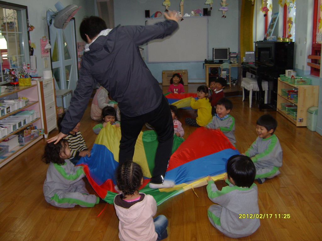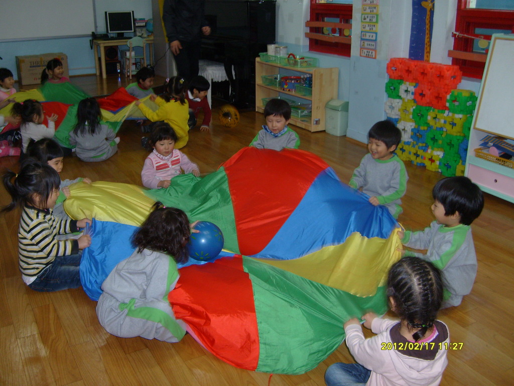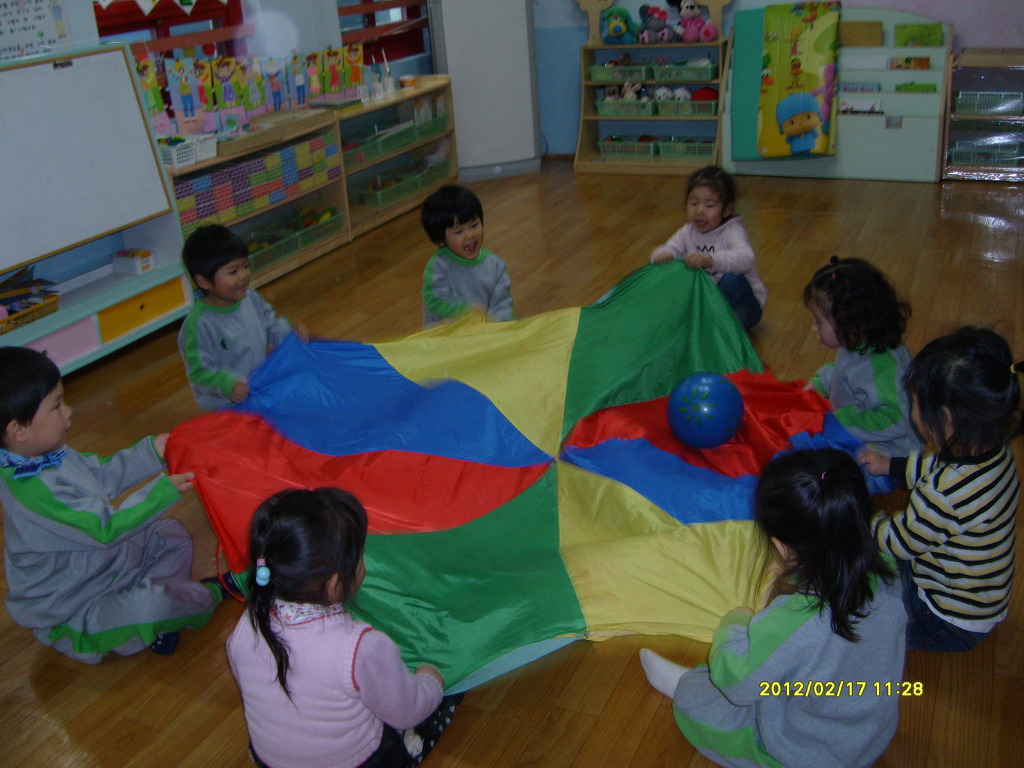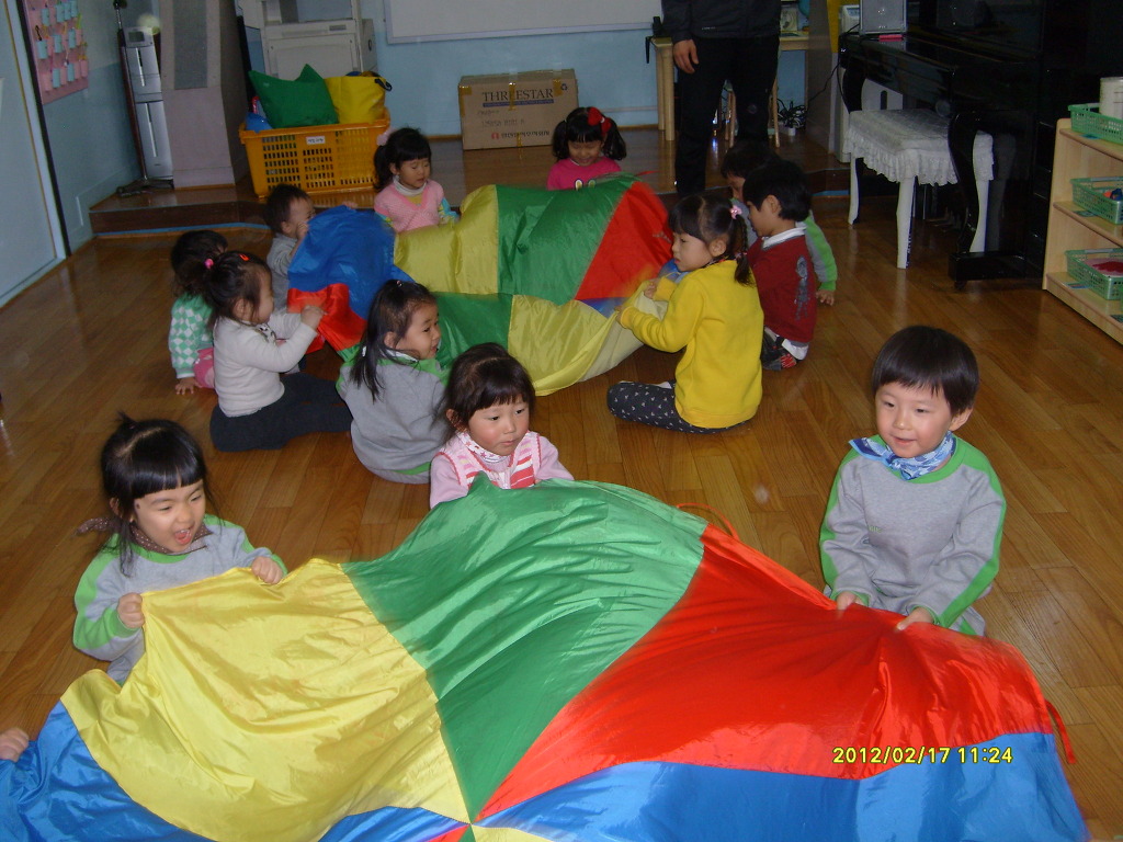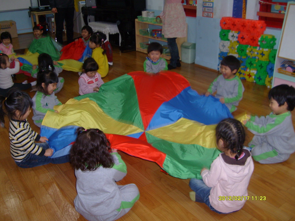 알록달록 낙하산 모양의 천을 음악에 맞추어 흔들어 보아요