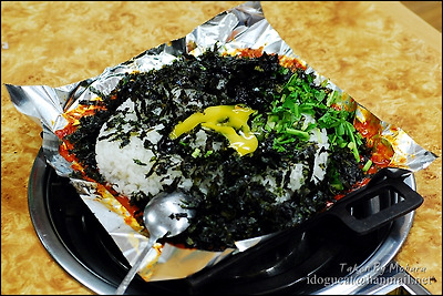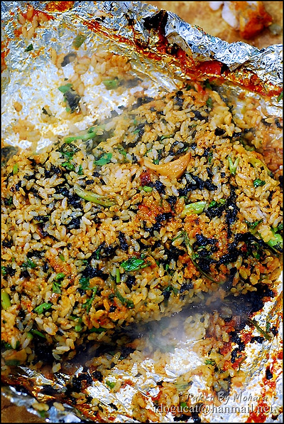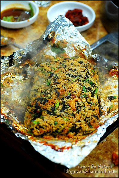 아직 복매운탕과 복튀김을 먹느라 바쁜 와중 완성되어 도착한 볶음밥은 호일로 잘 쌓여있어 그 열기를 담고 있다가 위처럼 호일을 여니 김이 모락모락~ 어찌 배부르다고 숟가락이 안 갈수 있겠습니까!!!