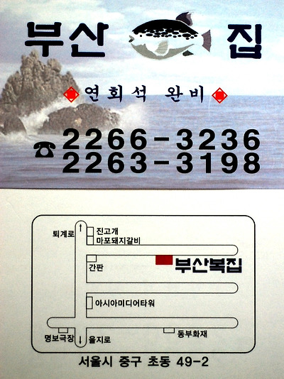 충무로를 대표하는 맛집 중 하나로 손 꼽히는 식당이 바로 30년 전통을 지닌 부산복집이라는 곳입니다. 비교적 저렴한 가격으로 푸짐하게 복어요리를 즐길 수 있으니 한 잔 거하게 시작할 수 있는 곳으로, 실한 한 끼식사를 즐길만한 곳으로 오랫동안 사랑을 받아온 집입니다. 세자매가 같은 이름으로 각기 다른 장소에서 운영을 하고 있는데, 큰 언니가 막내에게 이 집을 넘기고 극동빌딩 뒤편으로 가면서 이 본점은 막내가 건재히 꾸려 나가고 있는 집입니다.