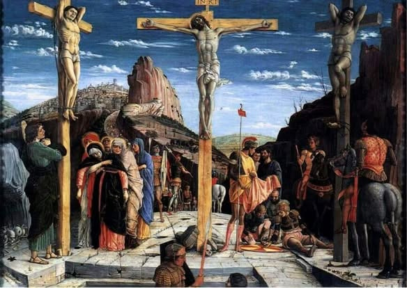 로마 병사들은 예수의 옷을 벗기고 십자가 위에 뉘어 대못을 박았다. 잠시 후 대못이 예수의 손목과 발등 위로 박혀졌다. 순간 예수의 얼굴은 일그러지면서 굳게 다문 입술 사이로 신음소리가 흘러나왔다. 얼마 후 병사들은 여럿이 달려들어 예수가 달린 십자가를 똑바로 세웠다. 그리고 사형수인 죄수 두 사람도 십자가에 못박아 예수 좌우 편에 한 사람씩 세워놓았다.