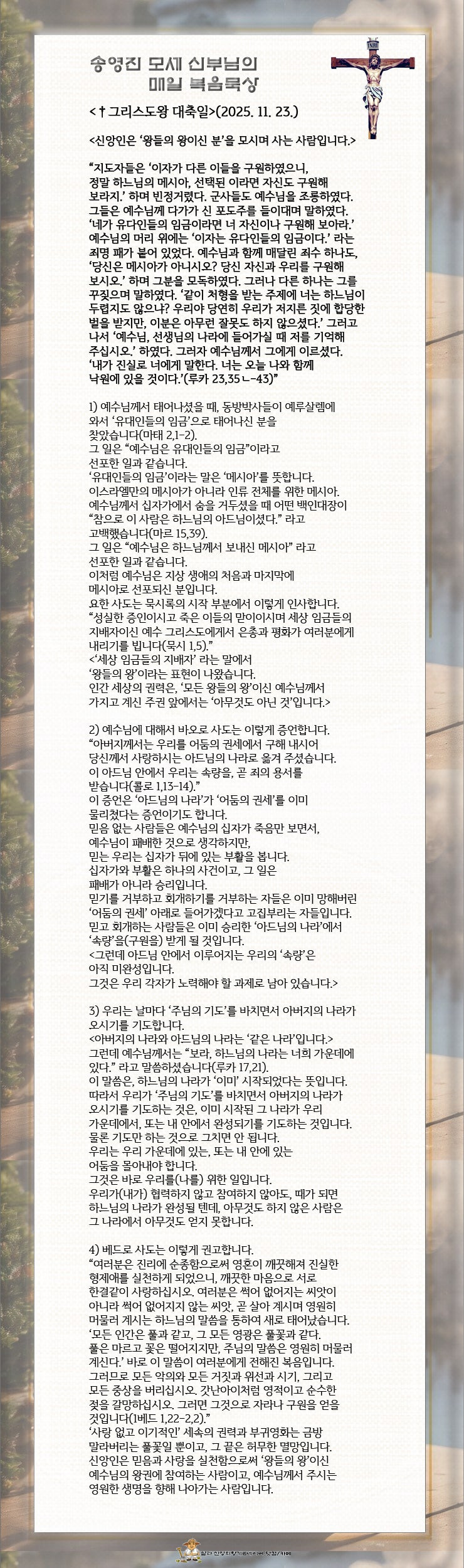오늘은 온 누리의 임금이신 우리 주 예수 그리스도왕 대축일입니다. 하늘과 땅의 모든 권한을 받으신 그리스도께서 우리의 왕이심을 기리는 날입니다. 그분의 다스림은 절대 권력의 행사가 아니라 바로 인간의 구원을 위하여 이웃을 섬기는 일입니다. 하느님께서는 그리스도를 왕으로 세우시고 그분의 십자가를 통하여 만물을 화해시키시어 우리가 하늘 나라에서 당신의 영광을 누릴 수 있게 하십니다.