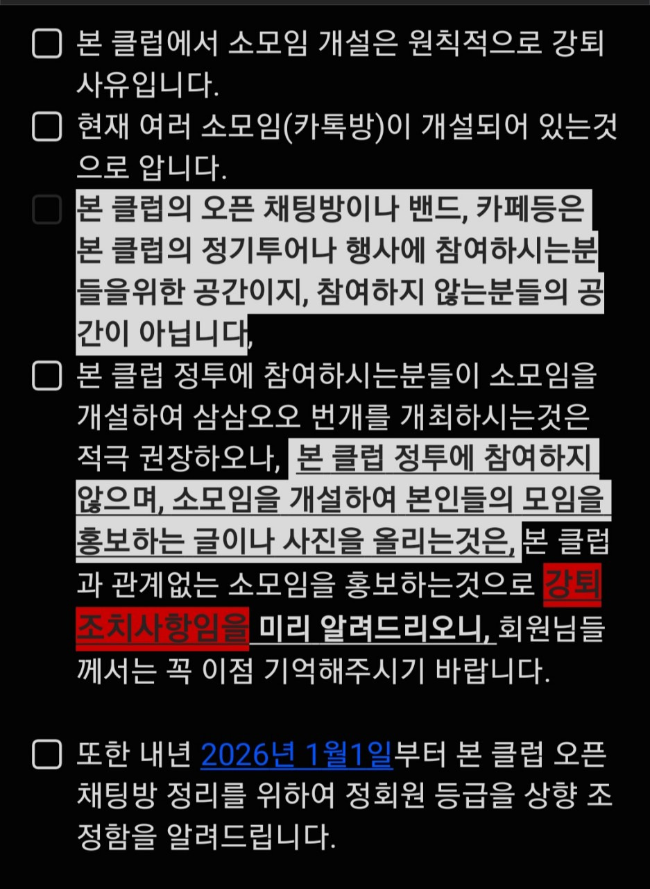 ■ 또한 내년 2026년 1월1일부터 본 클럽 오픈채팅방 정리를 위하여 정회원 등급을 상향 조정함을 알려드립니다.
