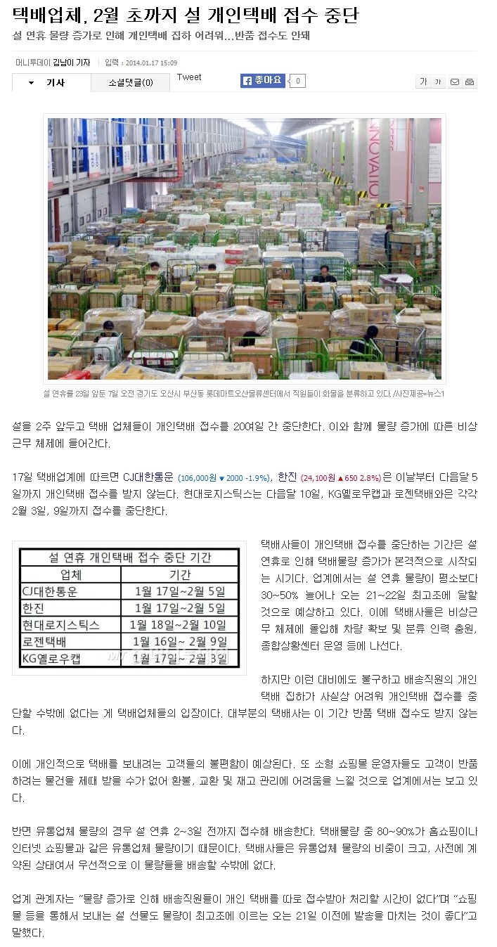 작성자v.rossi 작성시간 14.01.20 우체국집배원입니다...ㅜㅜ 머 저렇게 뉴스에 나오지만...매 명절때마다 있는일입니다. 머 별루 특별한 일도 아니에요.. 매번명절때 우체국외에 타 택배회사들은 명절때쯤 되면...개인택배접수를 안받아요..지금은 아니지만.. 개인 방문 픽업은 우체국도 명절때쯤에는 받지 않았습니다. 우체국 방문하시면 접수는 당연히 해드렸지만....아~~ 이렇게 댓글 남기는 것도 명절전에는 오늘이 마지막이군요...내일부터 전쟁에 돌입합니다..기운좀 주세요..그리고 기도해주세요..29일까지 출근하는데..비나 눈이 오지말라고...기도 해주세요 회원님들...