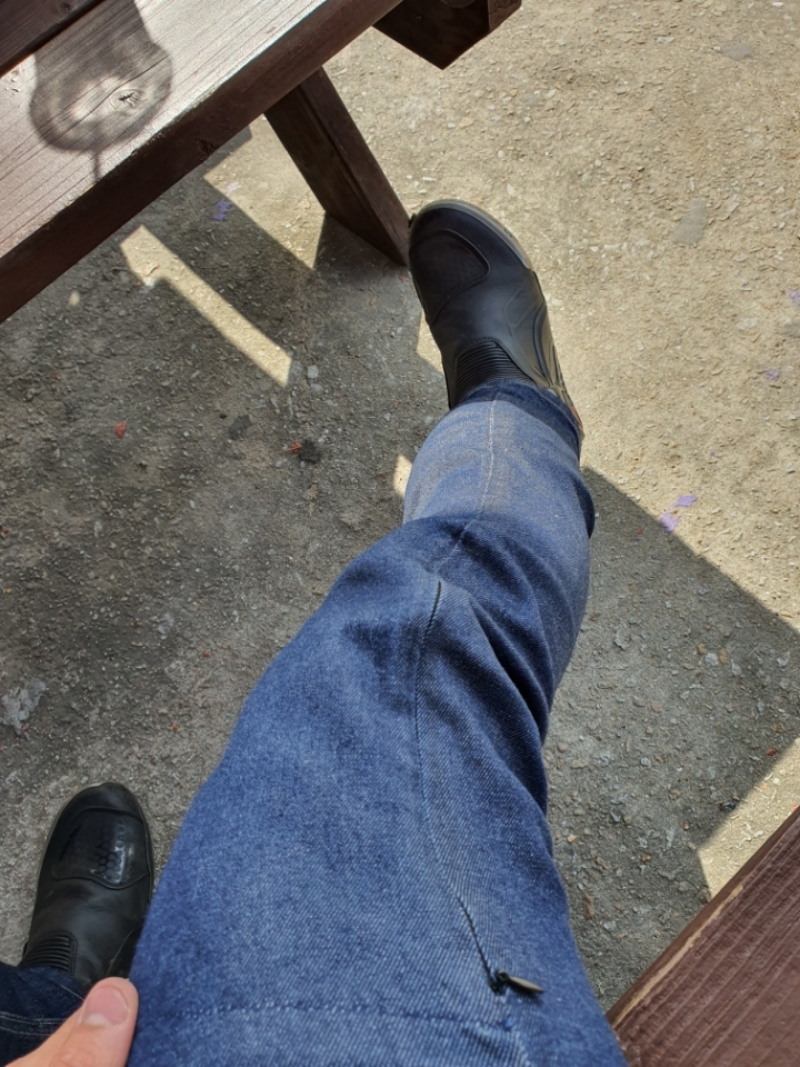 스판끼가 있어서 라이딩시에도 크게 불편한 느낌은 받지 못했으나 밑에 사진처럼 보호대와 더불어 바지가 안쪽으로 계속 돌아가더라구요.