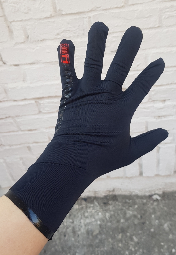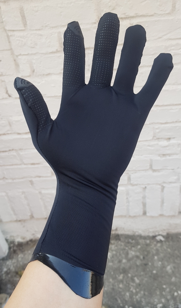 전체적인 앞뒤 모습입니다. 손까락에는 미끄럼방지 처리가 되어있고 엄지와 검지에는 스마트폰 터치가 가능하도록 마감처리가 되어있습니다. 손목쪽에도 미크럼방지처리가 되어있는데 안쪽 피부쪽이 아니라 왜 바깥쪽으로 되어있는지는 잘 모르겠네요. 외부 가죽장갑이랑 따로 놀지 마라는 용도로 만들어놓은 것같은데 피부에서 이탈되지않게 안쪽으로 처리하는게 더 좋지않나 잠시 생각해봤습니다.
