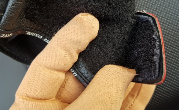 이너장갑을 낀 상태로 가죽장갑을 착용할 때 손목부분을 잠그기 위해 벨크로 부분(찍찍이)을 잡아야 하는데