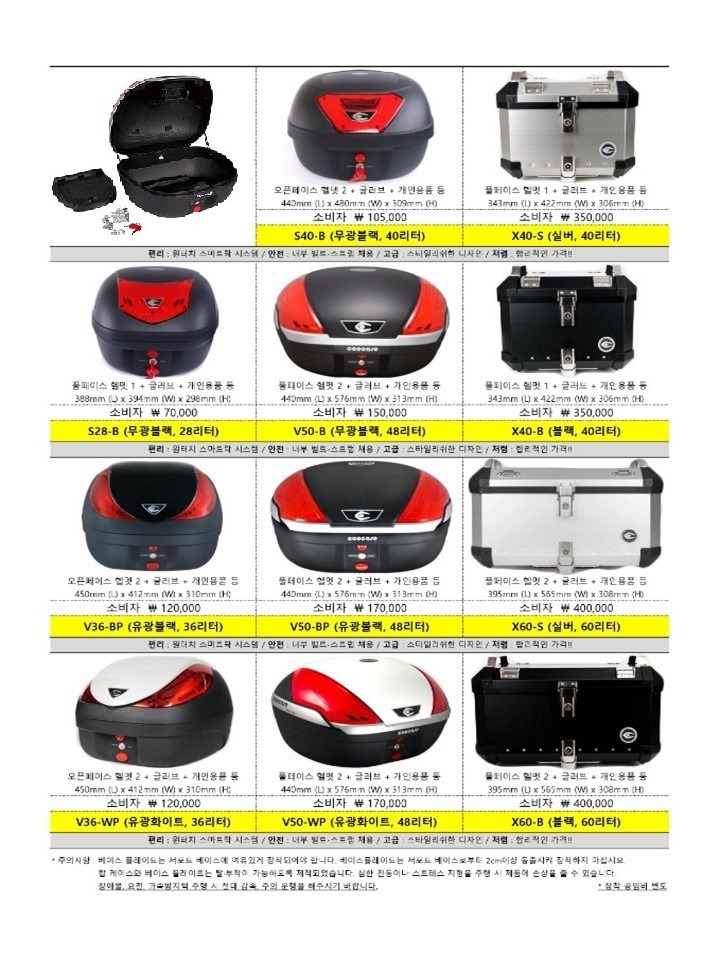 가격 : 28L 70,000원 , 36L 110,000원 , 40L 95,000원 , 50L무광 150,000원 , 50L유광 170,000원