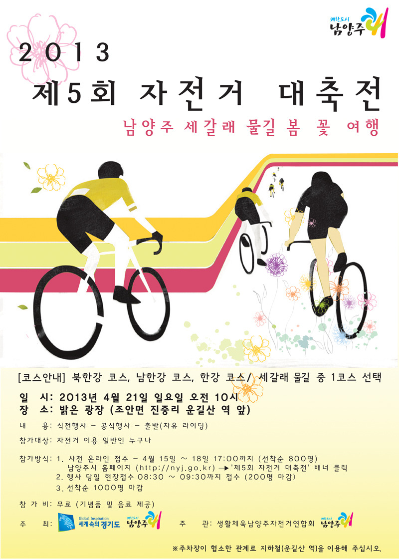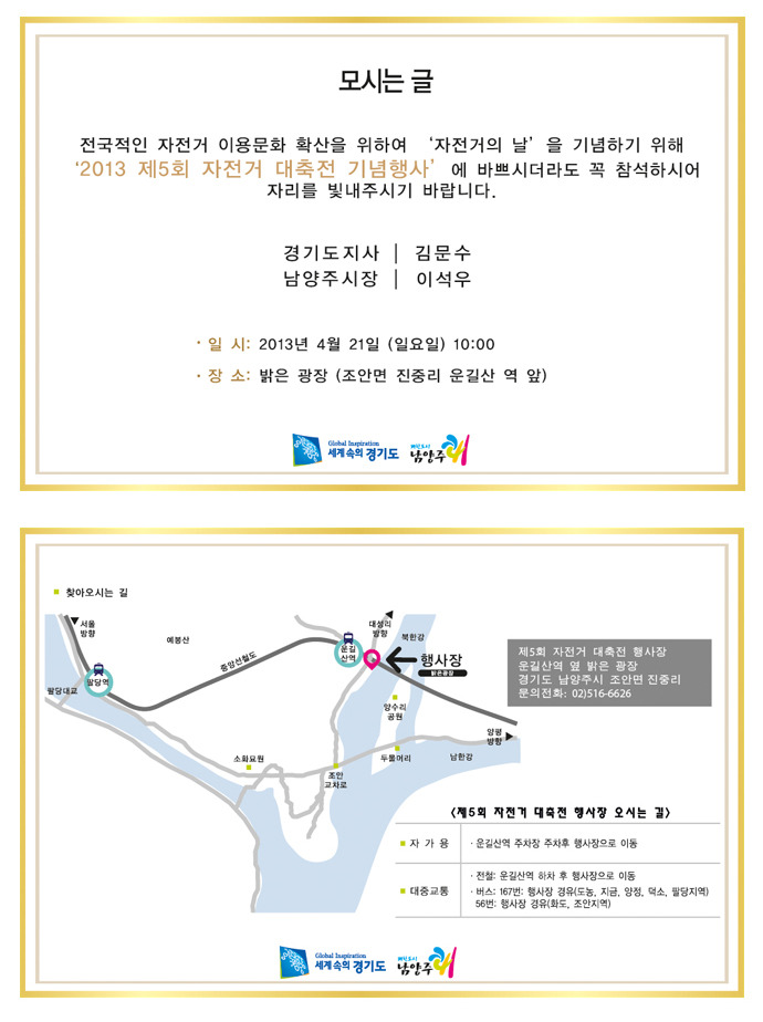 2013년 제5회 자전거대축전 행사를 "남양주시자전거연합회"주관으로 남양주시에서 개최하게 되었습니다.