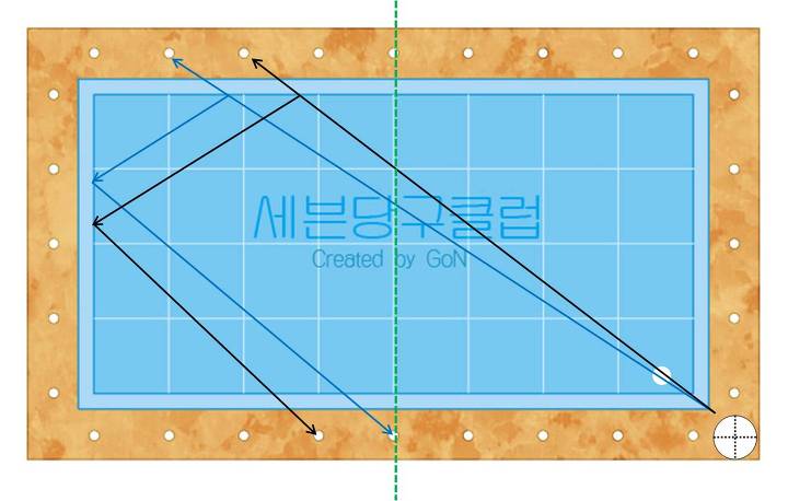 그림 2에 보는 바와 같이 당구대의 장 쿠션에는 7개의 포인트가 있고, 단 쿠션에는 3개의 포인트가 있다. 4개의 모퉁이에 표시한 2개씩의 포인트는 대부분의 당구대에 표시가 되어 있지 않는 가상의 포인트이다.