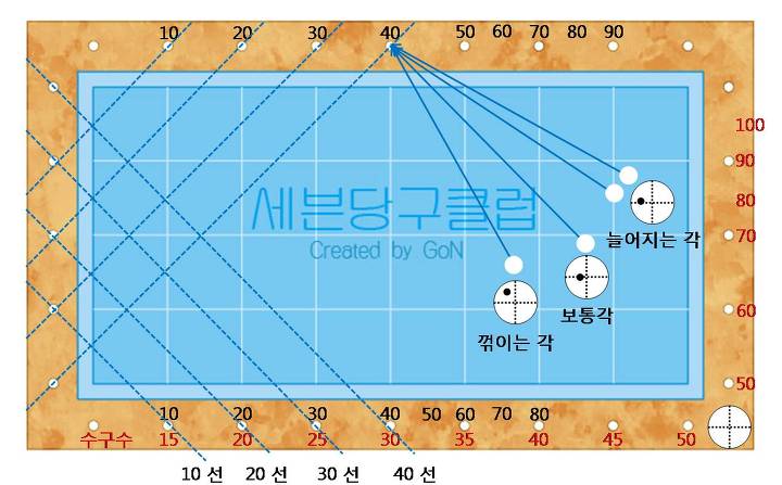 파란색 점선으로 표시된 선을 앵글라인(Angle Line)이라 한다. 장 쿠션의 10포인트와 단 쿠션의 10포인트를 연결한 선을 10선이라고 하고, 그렇게 20선, 30선, 40선을 연결하여 가상으로 그릴 수 있다. 이 선들을 활용하여 쉽게 빈 쿠션의 각도를 정할 수 있다.