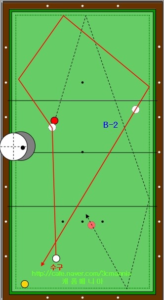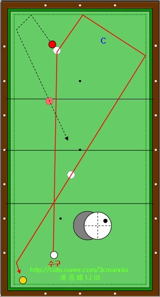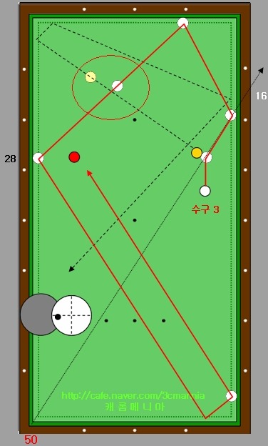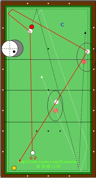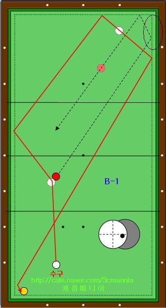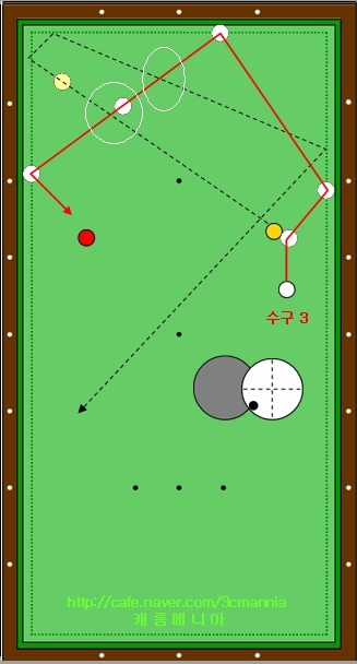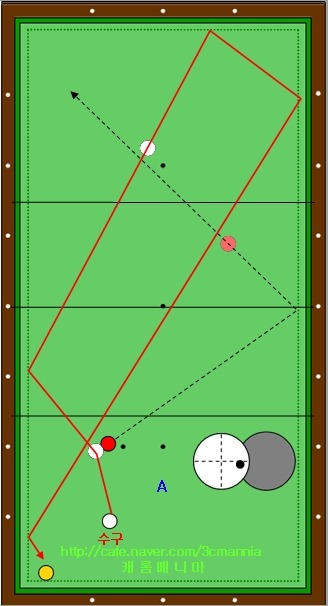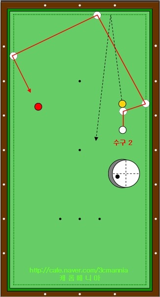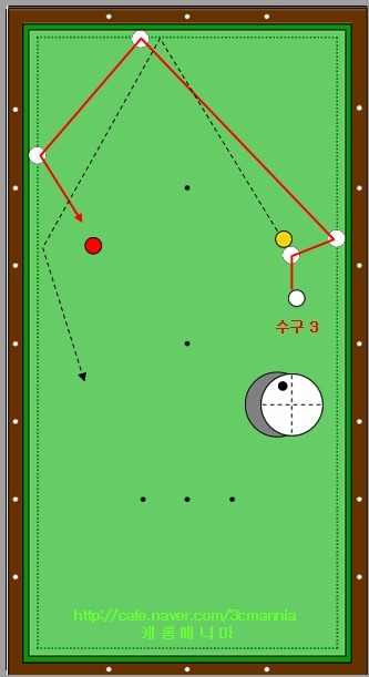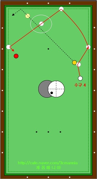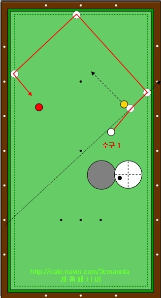 그림속의 하얀색 점선의 경로를 따라 1적구가 진행을 하여 테이블 중간의 동그라미가 그려져 있는 영역에서