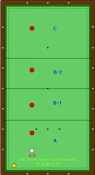 1적구가 도착해야 하는 범위는 위 그림에서 동그라미가 그려져 있는 범위에 오도록 겨냥을 해야 합니다