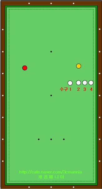 이때는 절반정도의 두께로 반드시 코너 근처의 장축에 1적구가 먼저 맞을 수 있도록 1적구의 두께를