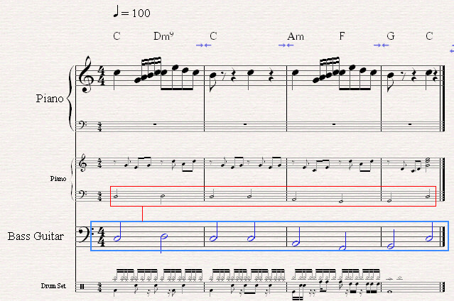 반주악기(피아노, 기타...)에서 만들어진 Bass Line 과...