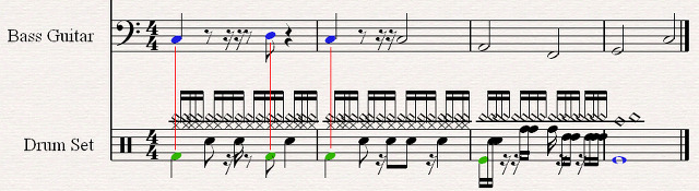 즉, kick 연주가 있는 자리에서는, Bass 연주가 함께 움직이는 것이 음악을 다이나믹하게 들리게 하며,