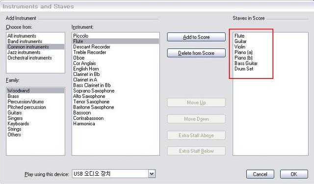 - 왼쪽의 메뉴에서 instruments 클릭 (sibelius version 4 와 5 에서는 Staves메뉴에 들어있습니다)