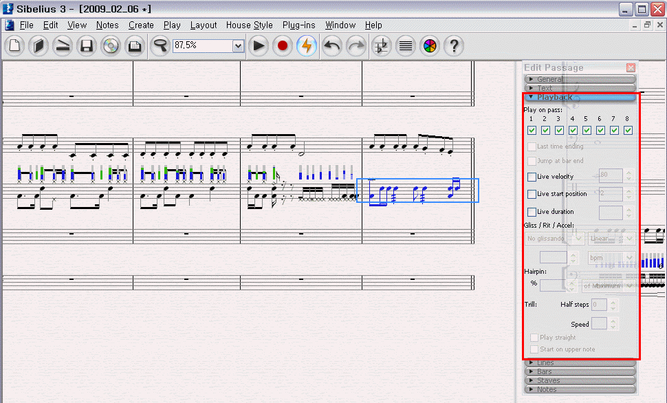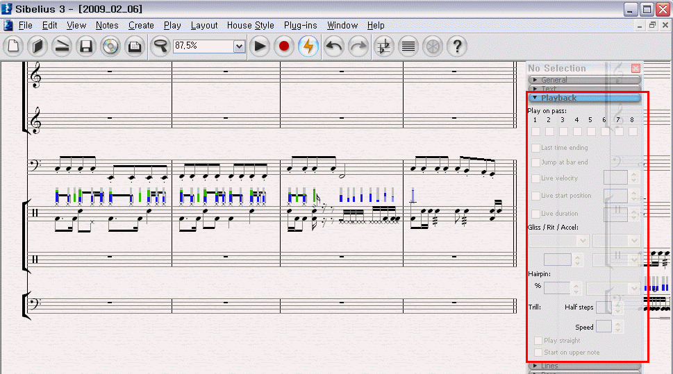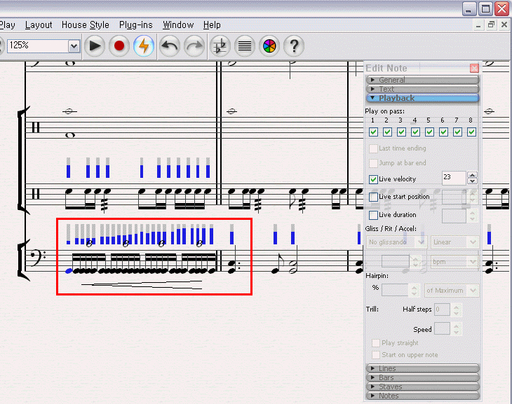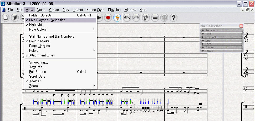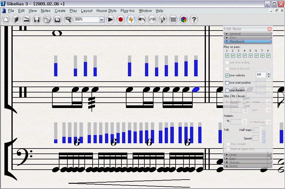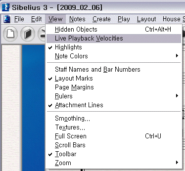 시벨리우스 자체 편집 기능 가운데, 하나인.. 벨로시티 조절은,