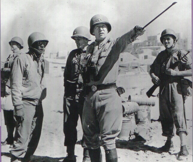 (승마용 바지를 군복 바지 대신 입고, 긴 부츠를 신은 패튼 장군이 지휘봉 대신 승마용 채찍으로 가르키고 있습니다.