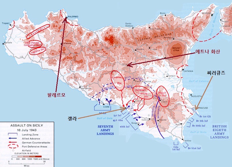 상륙작전에 앞서 7월 9일 자정에 섬 남서 해안에 위치한 갤라와 남동 해안에 위치한 씨러큐즈에 미군과 영국군 공수부대는 마침 불어온 시속 40마일의 강풍으로 넓게 분산되었습니다. (후에 노르망디 상륙작전도 마찬가지지만 상륙작전은 해안 상륙 병력 못지않게 중요한 것이 사전에 해안 내륙 쪽으로 투하되는 공수부대의 임무입니다.)