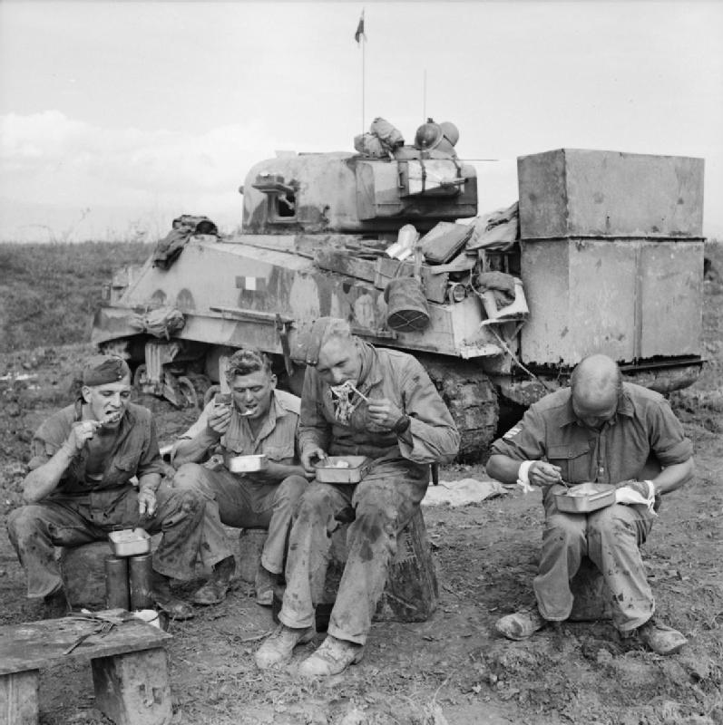 영국 기갑병들이 탱크 앞에 앉아서 식사를 하고 있습니다.)