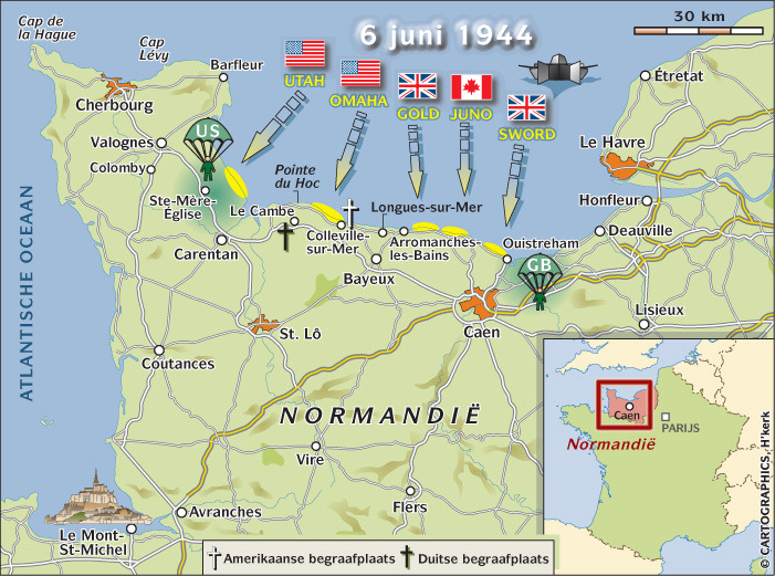 (노르망디 상륙 작전 개시 싯점에 투입된 연합군 부대 배치를 보여주는 지도)