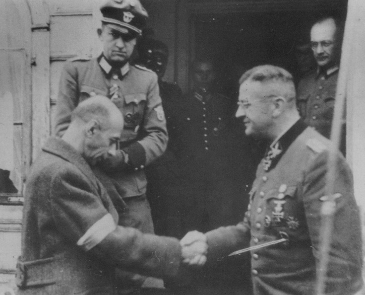 저항군의 항복 후 악수를 하고 있습니다. 고개 숙인 고모르프스키 장군의 표정과 웃음 띈