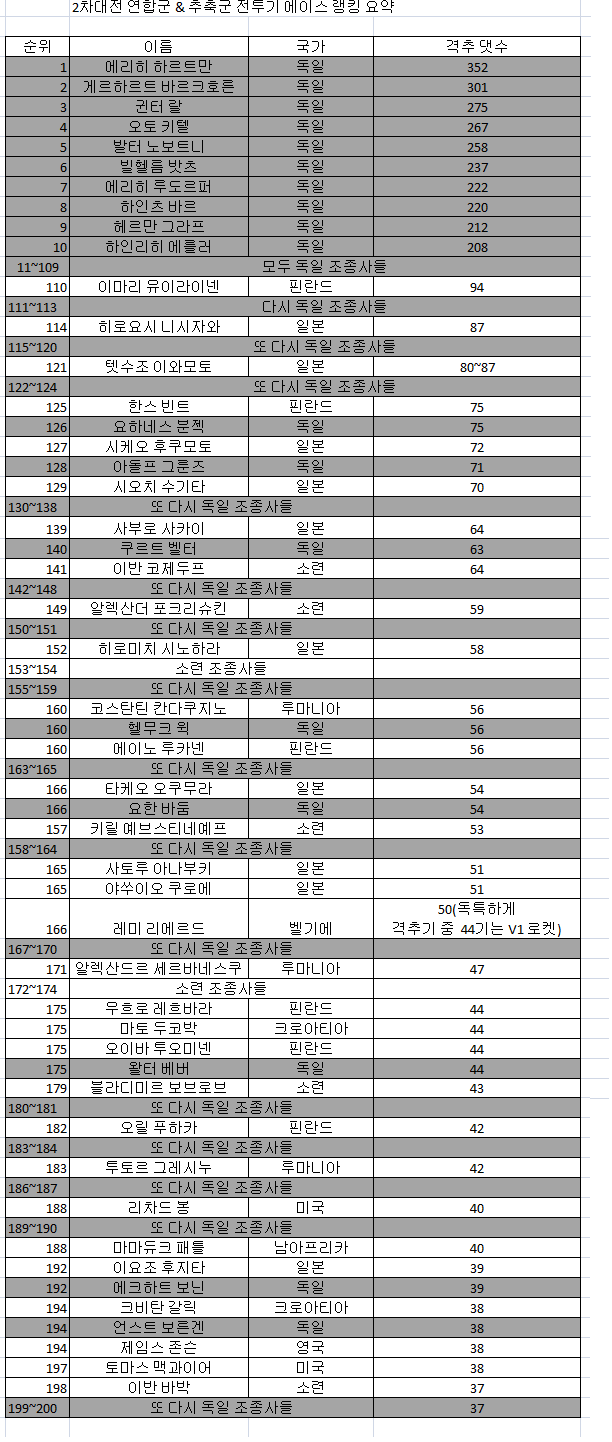 어쨌든 메서슈미트 Bf 109 전투기의 이야기의 장정을 시작하기에 앞서서 메서슈미트 조종사로써 에리히 하르트만의 352기 격추 기록이 과연 얼마나 대단한 것인가 2차대전 기간 중에 최고의 에이스들의 랭킹을 보면서 실감해보록 하겠습니다.