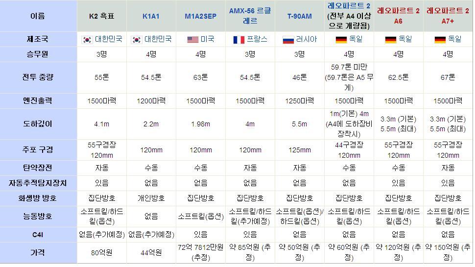 K2 흑표 탱크는 K1A1보다 약간 포탑이 커졌습니다. 어쨌든 아래 표에서 세계적으로 최강 MTB로 인정받는 탱크들과 성능 비교를 한 것을 봐도 K2 흑표 탱크가 전혀 밀리지 않거나 도리어 우월한 탱크임을 일 수 있습니다.