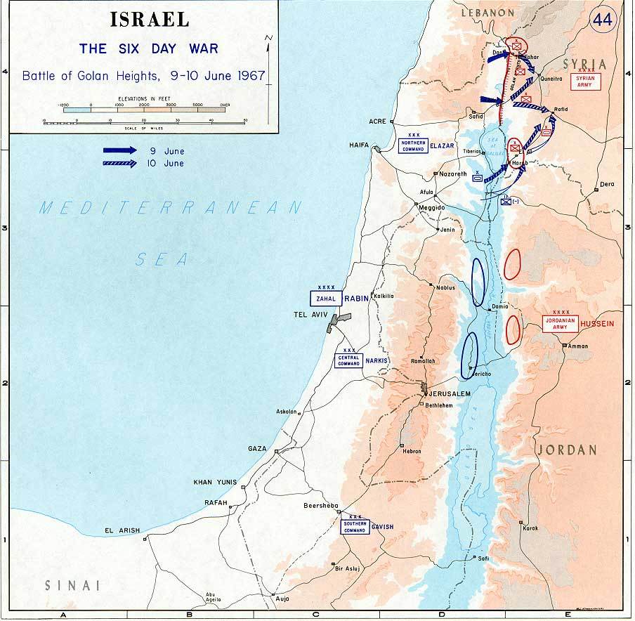 시나이 반도(이집트)와 웨스트 뱅크(요르단)에서의 전투가 속전속결로 이스라엘의 승리로 마감되어갔던 것과는 달리 북동쪽에 골란 고원을 중심으로 펼쳐진 시리아와의 전투는 쉽게 불붙지 않고 조용한 분위기가 계속되었습니다.