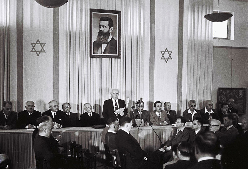 (1948년 5월 이스라엘 초대 총리 벤 구리언이 이스라엘 독립 국가의 개국을 선포합니다.)
