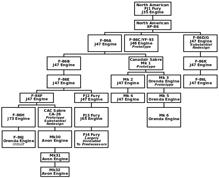 세이버 전투기는 엔진뿐만 아니라 다양한 개선을 거듭하면서 발전된 후속 버전을 개발합니다. 특히 아래 "세이버 패밀리"의 가계도를 보면 F-86D/G를 찾을 수 있습니다.