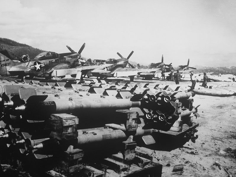 (1950년 한반도 상공에 출격 임무를 위해서 무스탕 전투기에 장착될 로켓탄들)