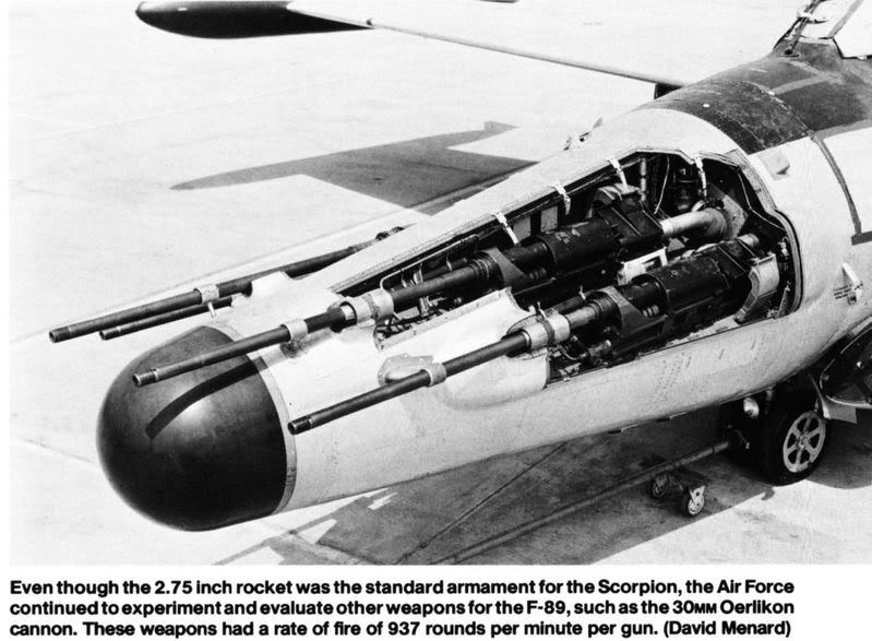 그나마 가장 많은 숫자가 생산된 F-89D는 1951년 10월에 생산이 시작되었고 1954년이 되어서야 실전 배치가 되었는데 거듭되는 설계 수정의 과정 중에 애초에 늠름하게 장착되었던 6정의 기관포들이 제거되었고 대신 70mm "마이티 마우스" FFAR 로켓탄들이 주요 화력으로 장착되었습니다. 이후 1959년 퇴역할 때까지 F-89는 신형 무기 체계(심지어 코르세어 전투기에 적용된 공대공 미사일까지) 열심히 적용되었지만 불안한 성능에 아무리 우수한 무기와 조종 장치를 억지로 적용한다고 해도 시간이 지나면 지날수록 이 기종의 열등함만 더 두드러질 뿐이었습니다.