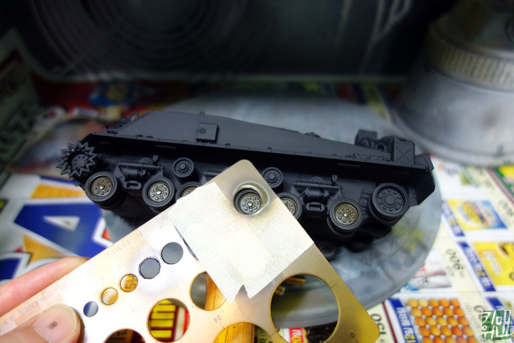 기본색 도색 전에 기동륜의 휠 부분은 탬플렛을 이용하여 좀 더 샤프하게 뿌려줍니다.