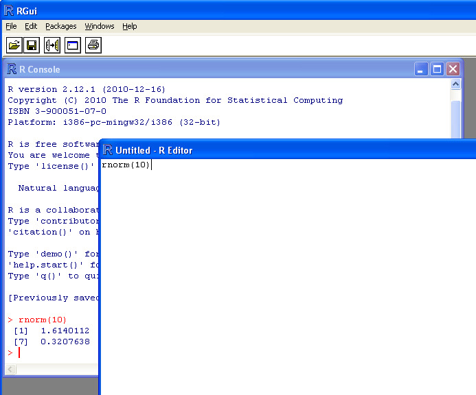 위 링크에 그림을 보면 위에 있는 Tinn-R로 명령어룰 입력하고 "-" 단추를 누르면 한줄씩 밑에 있는 R로 보내져 실행합니다.
