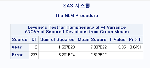 작성자안재형 작성시간 15.04.13 아직 출근을 안해서 SAS를 못돌려봤는데 이 문서를 보니 hovtest=levene(type=abs) hovtest=bf 를 사용했네요.