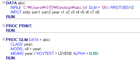 작성자ANOVA 작성시간 15.04.13 medcalc에서는 spss랑 결과가 같이 나옵니다. SAS쪽은 확실하지는 않으나 HOVTEST랑 LEVENE 사이에 =을 한번 빼고 해보시면?