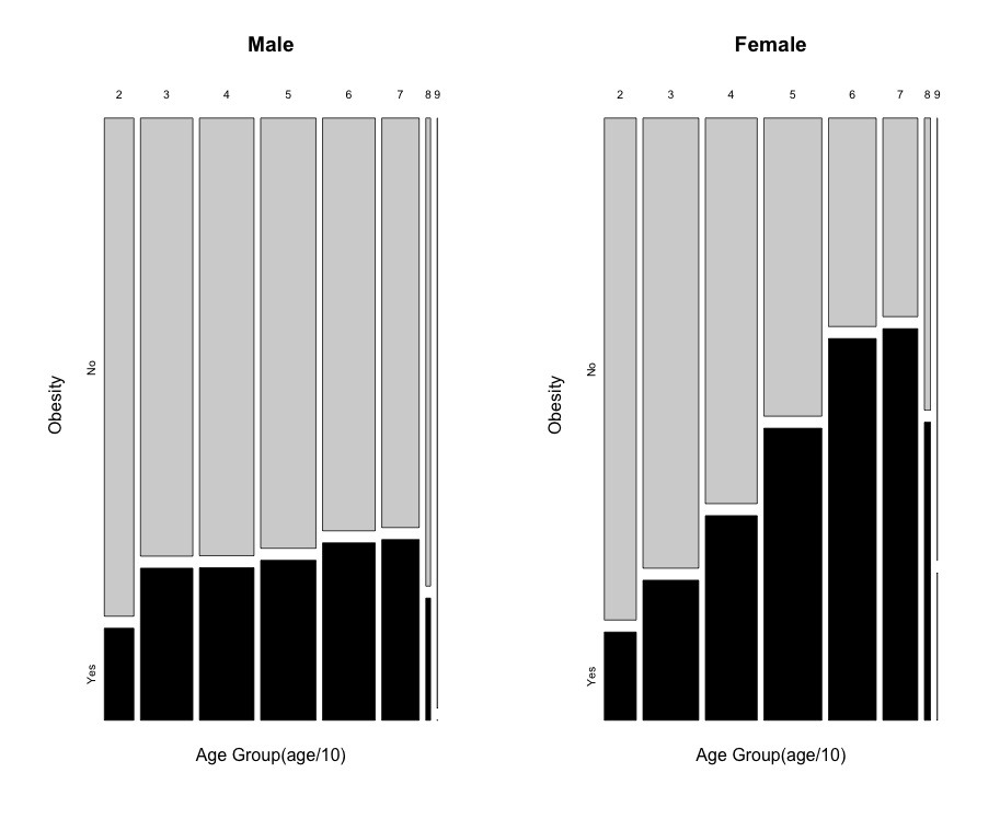 mosaicplot(~floor(age/10)+Obesity,MS_male,color=c("lightgray","black"),main=c("Male"),xlab=c("Age Group(age/10)"))