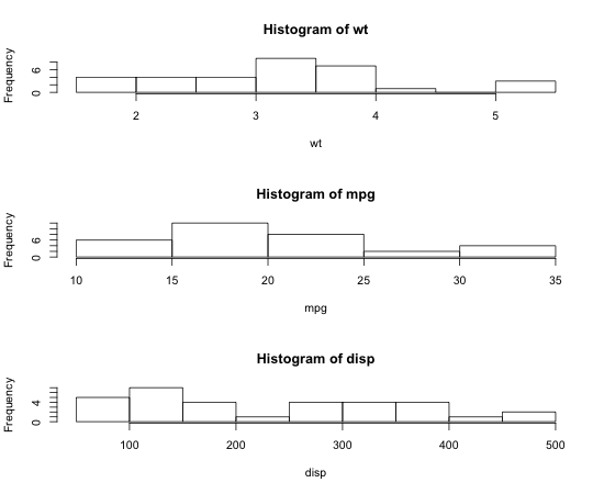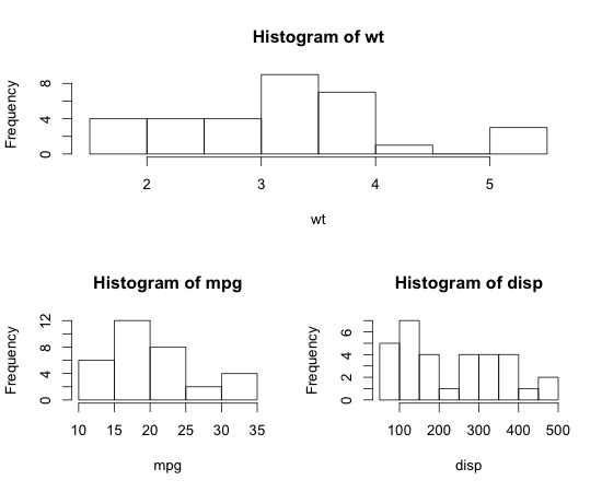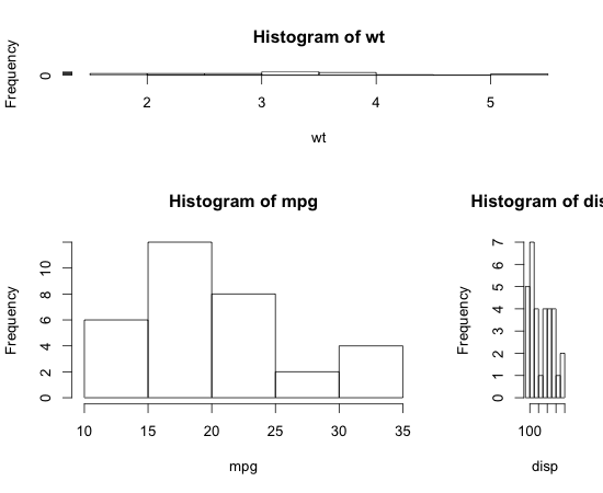 3) 열 또는 행 마다 그림 갯수를 달리할때 layout함수는 layout(mat)와 같은 형식으로 사용하는데 mat는 matrix object로써 여러 plot의 위치를 나타낸다. 다음 코드에서는 하나의 그림이 1열에 배치되고 두개의 그림은 2열에 배치된다. # Figure 3.16 attach(mtcars) layout(matrix(c(1, 1, 2, 3), 2, 2, byrow = TRUE)) hist(wt) hist(mpg) hist(disp) detach(mtcars) 결과는 그림 3.16과 같다. 4) 세밀한 그림 크기의 조절 경우에 따라 각 그림의 크기를 보다 정밀하게 조절하고 싶다면 layout() 함수의 옵션인 width= 와 height= 옵션을 사용할 수 있다. 다음과 같이 사용한다. width=각 행의 넓이의 값을 갖는 벡터 height= 각 열의 높이의 값을 갖는 벡터 상대적인 width는 숫자로 표현되며 절대적인 width는(cm) 1cm()함수를 사용하여 표시한다. 다음의 코드에서 한개의 그림은 1열에 두개의 그림은 2열에 배치되지만 1열의 그림의 높이는 2열 높이의 1/3이며 아래열우측의 그림의 넓이는 아래열좌측 그림 넓이의 1/4이 된다. # Figure 3.17 attach(mtcars) layout(matrix(c(1, 1, 2, 3), 2, 2, byrow = TRUE), widths = c(3, 1), heights = c(1, 2)) hist(wt) hist(mpg) hist(disp) detach(mtcars) 결과는 그림 3.17과 같다. 보는 것과 같이 layout()함수를 사용하면 최종 이미지 내의 그래프의 수와 배열, 그리고 상대적인 크기까지 조절할 수 있다. 보다 자세한 내용은 help(layout)을 이용해 보라.
