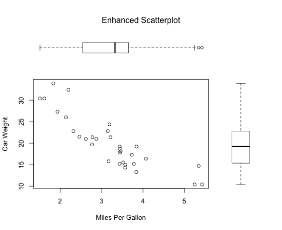 경우에 따라 하나의 의미있는 그래프를 만들기 위해 여러개의 그림을 배열하거나 겹쳐서 그려야 할 경우가 있다. 그러기 위해서는 그림 배치의 미세 조절이 필요한데 fig=라는 그래픽인수를 사용하면 가능하다. 다음의 코드에서는 scatterplot 에 두개의 boxplot를 더해서 전체 그림을 완성했다. 그림 3.18에 그 결과가 있다. # Listing 3.4 - Fine placement of figures in a graph opar <- par(no.readonly = TRUE) par(fig = c(0, 0.8, 0, 0.8)) # Set up scatter plot plot(mtcars$wt, mtcars$mpg, xlab = "Miles Per Gallon", ylab = "Car Weight") par(fig = c(0, 0.8, 0.55, 1), new = TRUE) # Add box plot above boxplot(mtcars$wt, horizontal = TRUE, axes = FALSE) par(fig = c(0.65, 1, 0, 0.8), new = TRUE) # Add box plot to right boxplot(mtcars$mpg, axes = FALSE) mtext("Enhanced Scatterplot", side = 3, outer = TRUE, line = -3) par(opar)