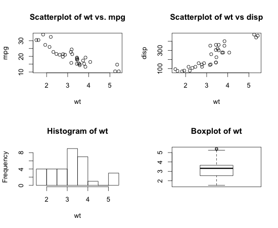 예를 들어 다음의 코드는 네개의 plot을 만들고 두열과 두행으로 배열한다. 내장 데이타인 mtcars를 사용한다. mtcars는 자동차에 관한 데이타로 궁금하신 분은 mtcars를 입력해보기 바란다.