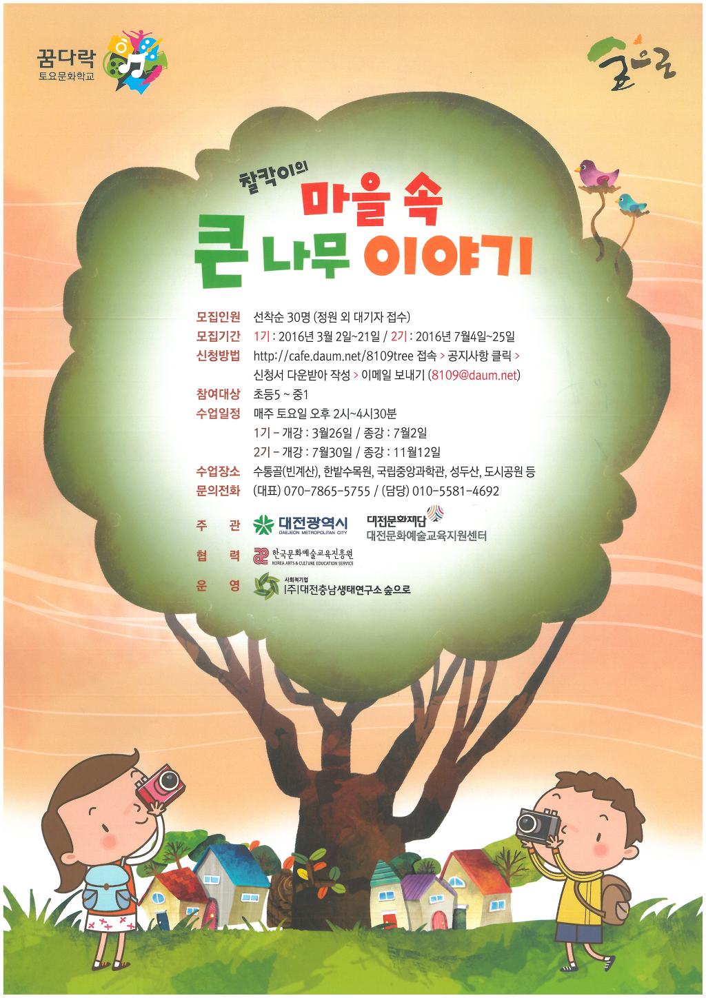 정보공유_ 2016 꿈다락토요문화학교"찰칵이의 마을속 큰나무이야기"2기 모집합니다. 작성자대전충남생태연구소숲으로|작성시간16.07.22|조회수113 목록 댓글 0 글자크기 작게가 글자크기 크게가 다음검색 현재 게시글 추가 기능 열기 북마크 공유하기 신고 센터로 신고 댓글 댓글 0 댓글쓰기 답글쓰기 댓글 리스트