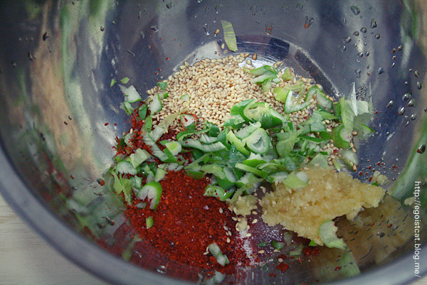 양념장 : 고추가루 4수저, 간장 4수저, 다진마늘 2수저, 물 1수저, 물엿 1수저, 참기름 약간, 다진파 약간, 통깨 약간