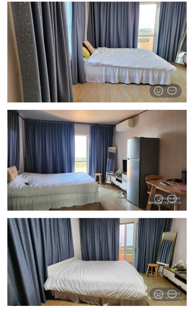 '하늘방', '바다방', '별방' 모두 원룸형 오션뷰 객실로, 창밖으로 펼쳐지는 논짓물 바다의 풍경을 감상할 수 있습니다.