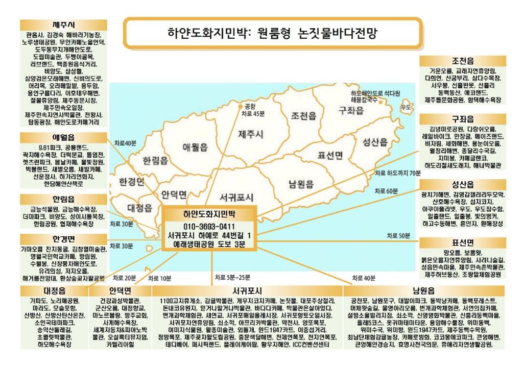 * 차로 20분 이내: 카멜리아힐, 파더스가든, 제주당베이커리, 마라도/가파도 선착장 등