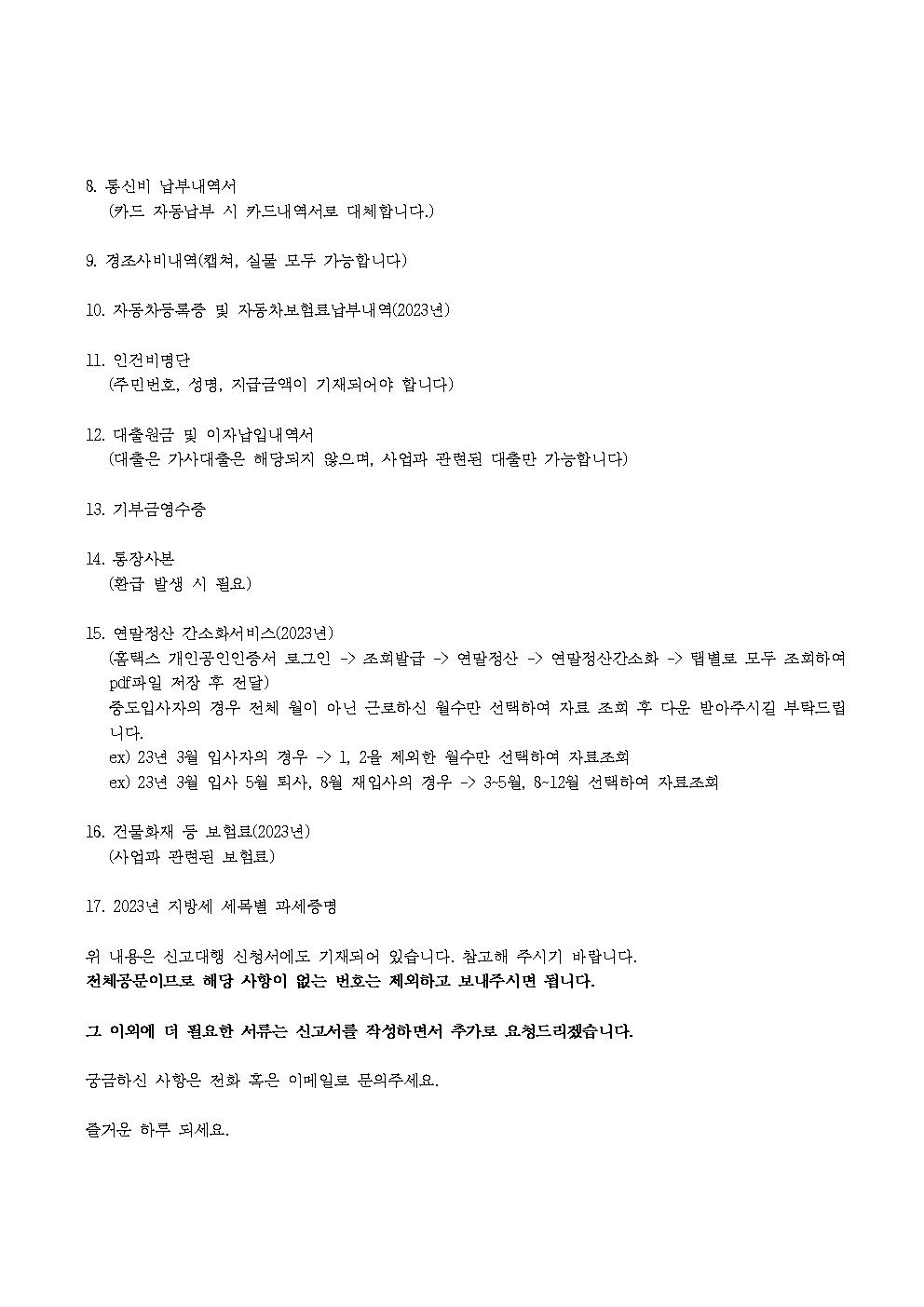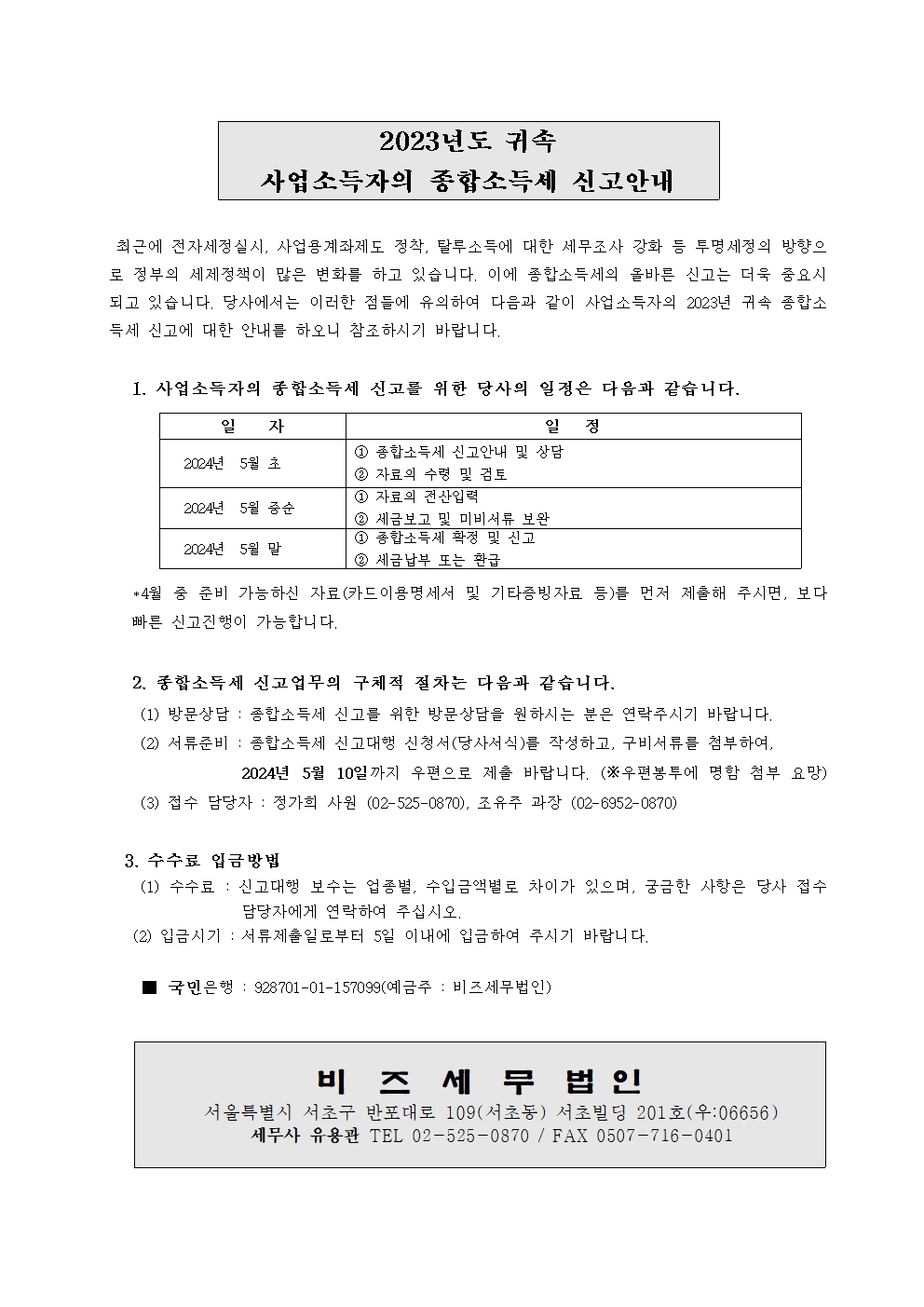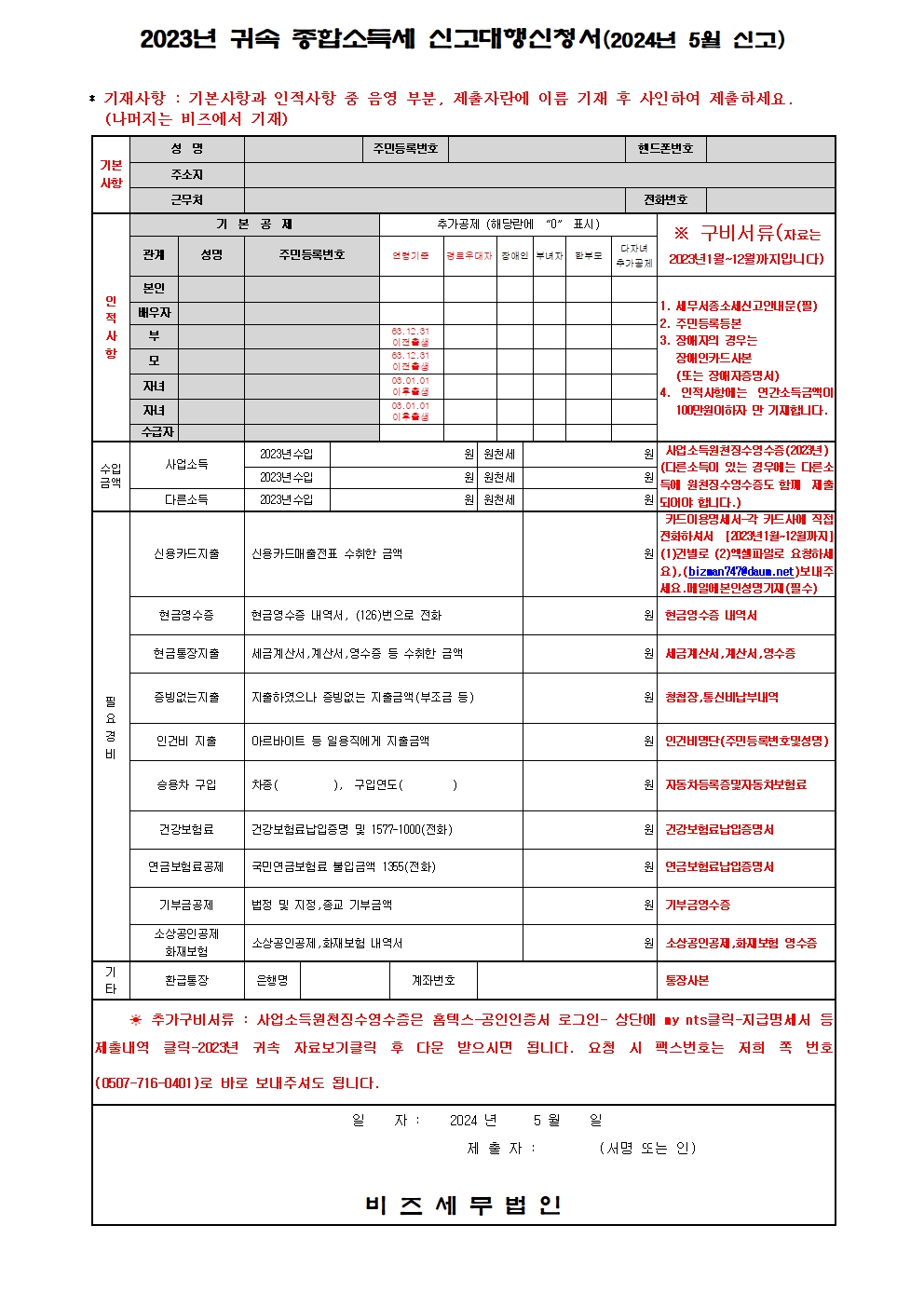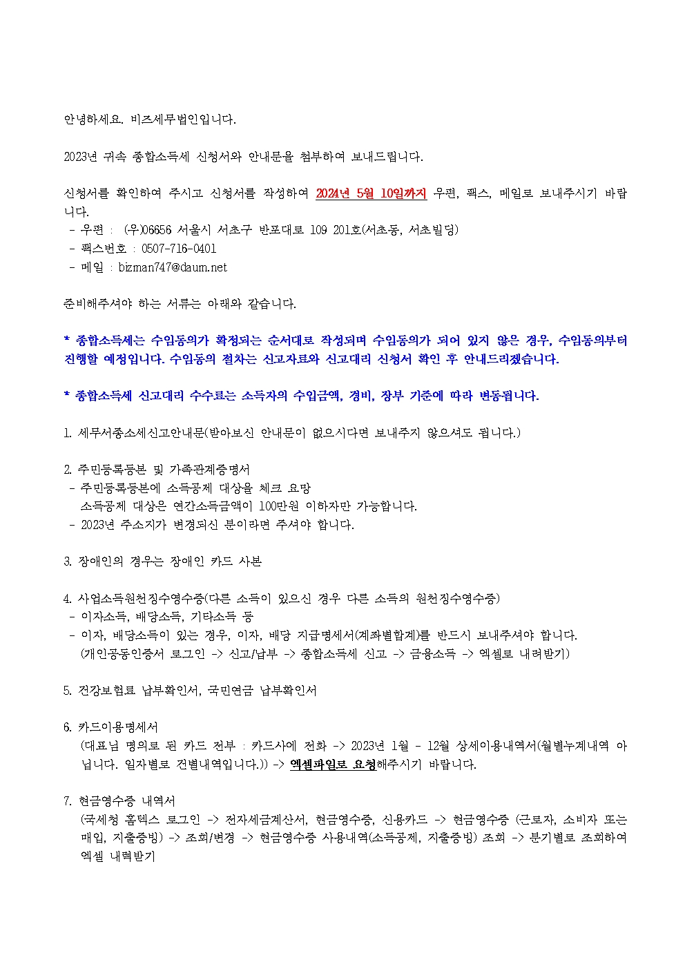 2023년 귀속 종합소득세 신고안내(2024년 5월) (첨부서류 참조) 작성자비즈맨 2|작성시간24.04.12|조회수634 목록 댓글 0 글자크기 작게가 글자크기 크게가 2023년귀속 종합소득세 확정신고안내문.hwp112.00KB2023년귀속 종합소득세_신고대행신청서.hwp96.00KB 첨부파일첨부된 파일이 7개 있습니다. jpg 파일 2023년귀속 종합소득세 확정신고안내문001.jpg 다운로드 jpg 파일 2023년귀속 종합소득세_신고대행신청서001.jpg 다운로드 jpg 파일 종합소득세 이메일 안내문001.jpg 다운로드 jpg 파일 종합소득세 이메일 안내문002.jpg 다운로드 jpg 파일 종합소득세 이메일 안내문003.jpg 다운로드 hwp 파일 2023년귀속 종합소득세 확정신고안내문.hwp 다운로드 hwp 파일 2023년귀속 종합소득세_신고대행신청서.hwp 다운로드 다음검색 현재 게시글 추가 기능 열기 북마크 공유하기 신고 센터로 신고 댓글 댓글 0 댓글쓰기 답글쓰기 댓글 리스트